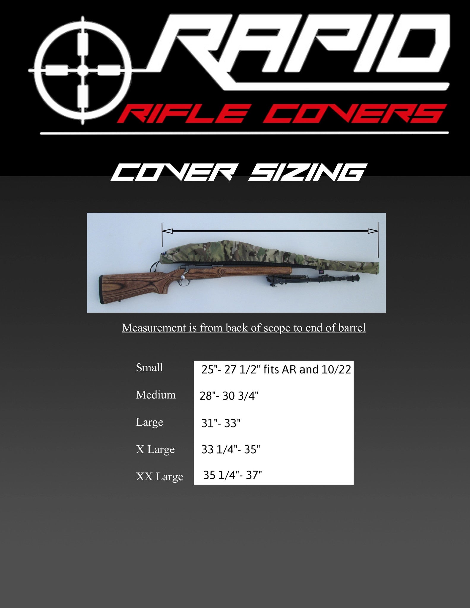SIZING: 5 sizes are available for a near custom fit. Offering sizing for most rifles, muzzloaders and AR style rifles. Size is based on measurement from start of scope (eyepiece) to end of barrel (see Sizing Chart and Video).